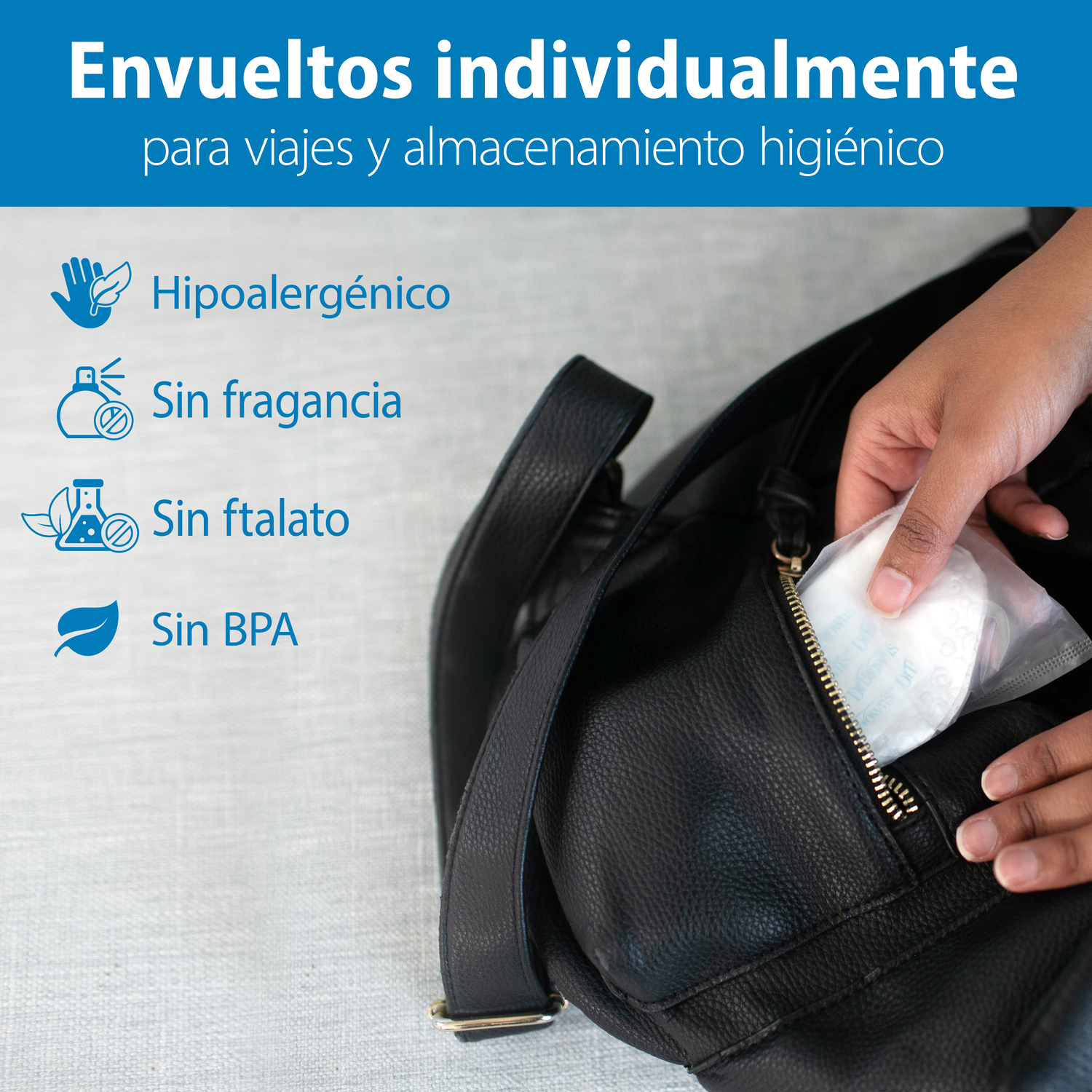 • Las almohadillas están envueltas en paquetes de dos para guardarlas y llevarlas en forma higiénica.