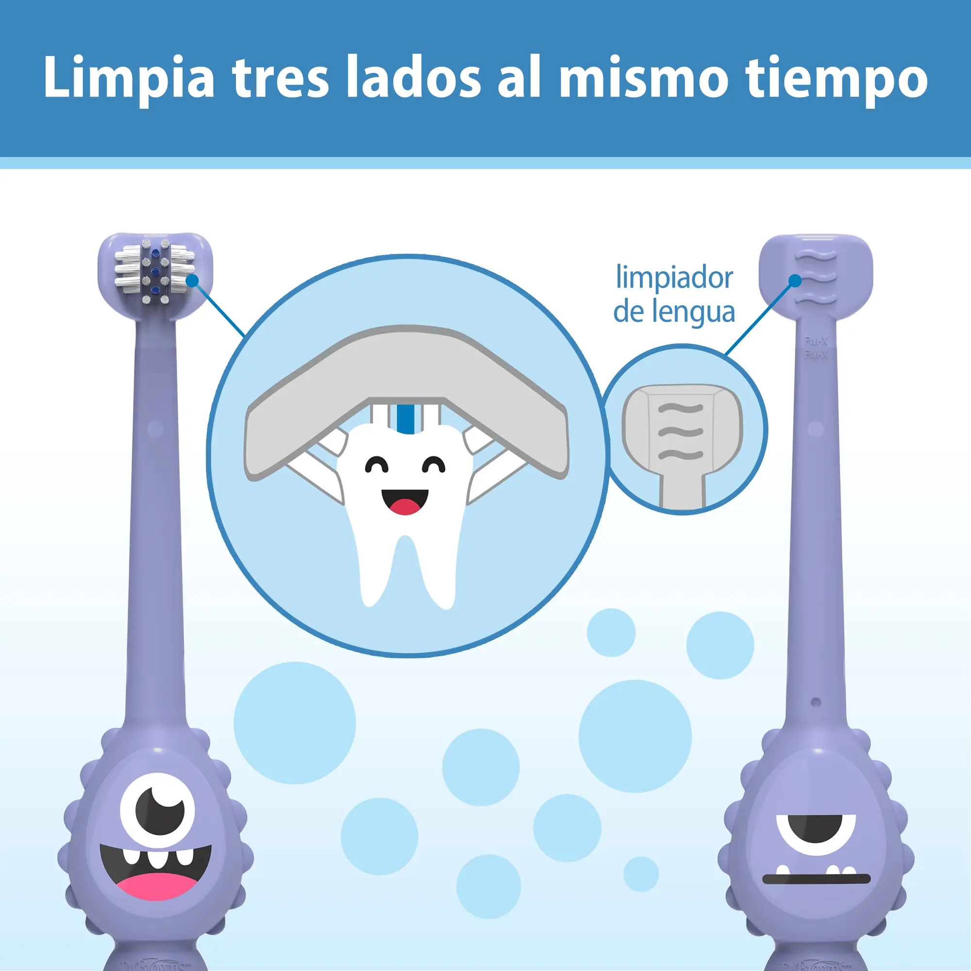 • Cepillo de dientes de tres caras con filamentos suaves, que se envuelven alrededor del diente para limpiar tres superficies a la vez.